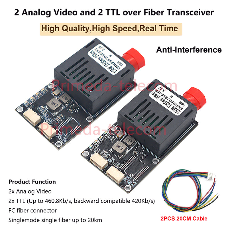 This optical transceiver include a sky end (TX/1310nm) and a ground end (RX/1550nm), it is developed for drone signal transmission system with 2 analog video and 2 TTL level signal over an optical fiber cable for long distance transmission. High speed and stable transmission, Anti-interference. Widely used in various scenarios that require long-distance, high-quality video transmission, such as telecommunications, power, monitoring, industrial control, and other fields