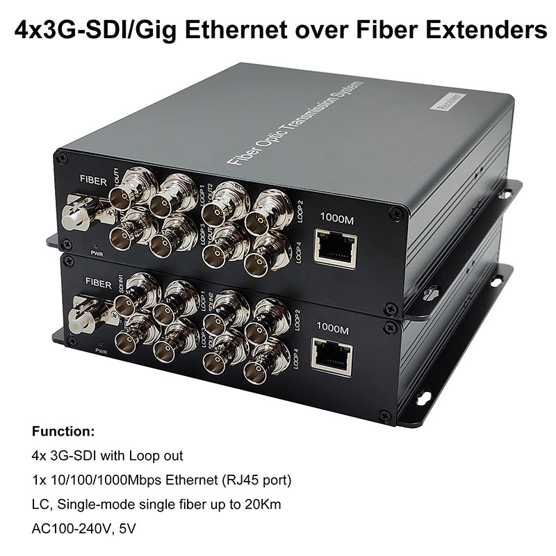 1. Extend 4 channels of uncompressed 3G-SDI, HD-SDI or SD-SDI video over single fiber optic cable. Single-Mode Fiber transmission distances up to 20Km(12.4miles), Compatible with multi-mode Fiber up to 300Meters.