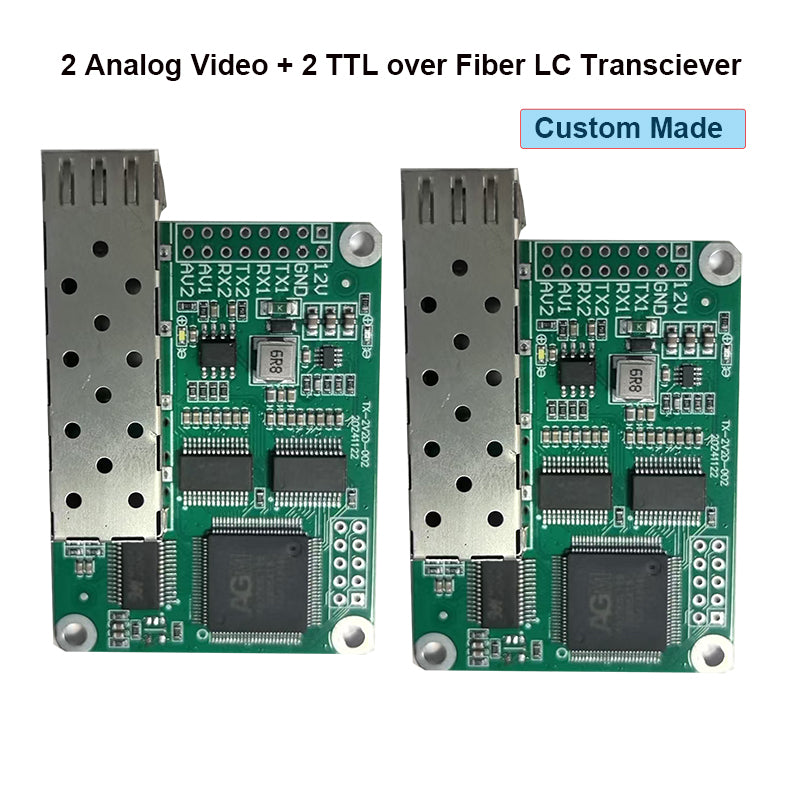This device include a sky end (TX) and a ground end (RX), Developed for drone signal transmission system with 2 analog video and 2 TTL level signal over an optical fiber cable for long distance transmission. High speed and stable transmission, No interference.