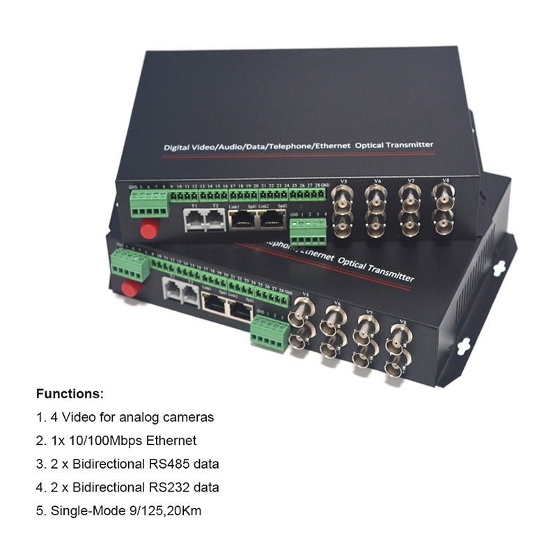 Эта модель представляет собой многофункциональный цифровой Видео/Данные/Ethernet через один оптоволоконный медиаконвертер с 4 каналами Видео (для аналоговых камер) и одним 10/100 Мбит/с Ethernet, который может быть применим для расширения компьютерной сети, а также применим для IP-камер. и два двунаправленных данных RS-485 для удаленного управления камерами и два двунаправленных данных RS-232. Доступны функции телефона и сухого контакта для добавления.