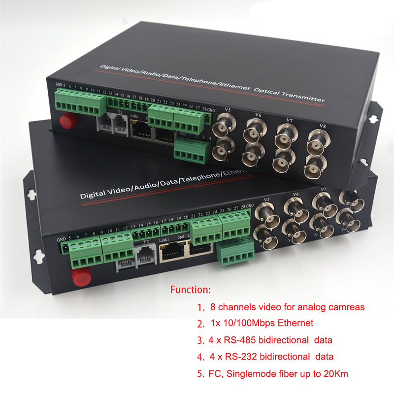 Он может передавать 8 каналов видео (для аналоговых камер) по оптоволокну, одномодовому оптоволокну до 20 км, совместимому многомодовому оптоволокну до 500 м.