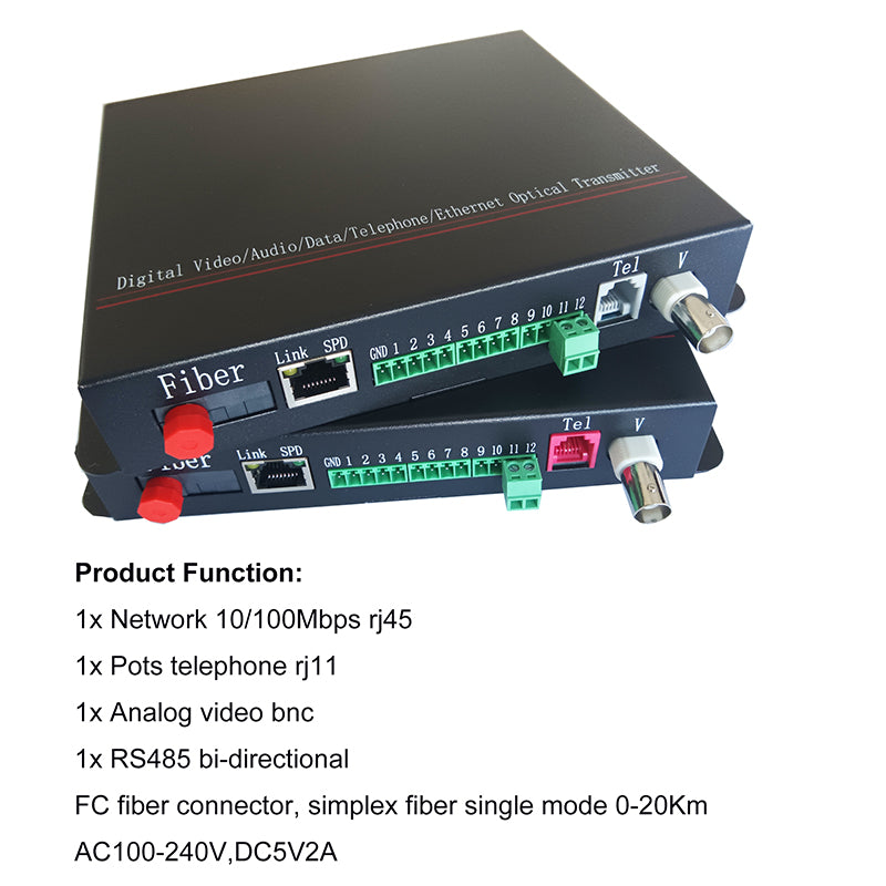 Эта модель представляет собой многофункциональный медиаконвертер для передачи аналогового видео/телефона/данных RS485/10/100 Мбит/с Ethernet по оптоволокну, одномодовое симплексное волокно до 20 км, совместимое с многомодовым волокном до 500 метров.